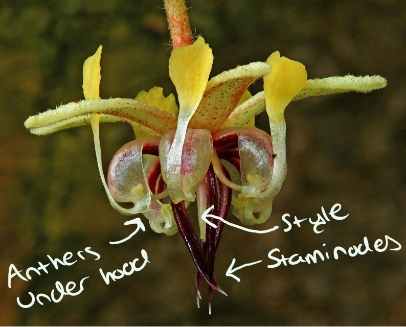 I want to direct your attention to the structure known as the staminode. It’s like the stamen, the male part of the flower, but these don’t produce pollen and are therefore sterile. The pollen producing anthers are hidden by hoods and can only be accessed by tiny insects near the base of the flower.