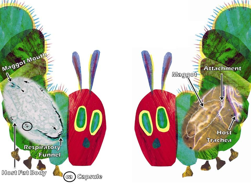 Picture of Exorista larvarum captured by Valigurová et. al 2014 superimposed over Eric Carle’s The Very Hungry Caterpillar. The respiratory funnel can be seen as a black line over the legs.