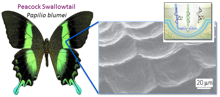 Kolle M, Salgard-Cunha PM, Scherer MRJ, Huang F, Vukusic P, Mahajan S, Baumberg JJ, Steiner U. 2010. Mimicking the colourful wing scale structure of the Papilio blumei butterfly. Nature Nanotechnology 5:511-515.