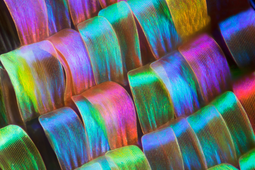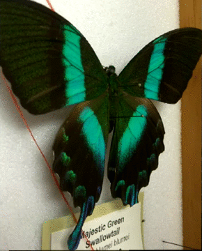 In this case, the scale structure looks like a little bowl and color production depends on the width and depth of the dish. This is how this Peacock Swallowtail (Papilio blumei) makes that greenish-blue-phase shifting green color.