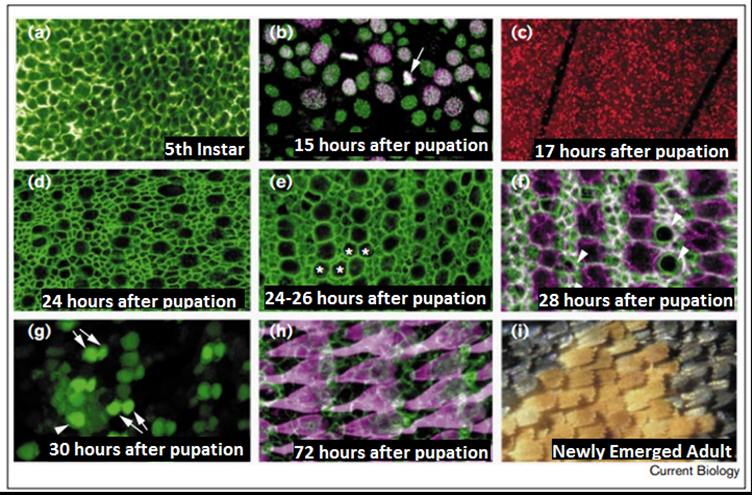 If you’re the type of butterfly that makes color with nano-structures, then your scales are elaborately formed to play tricks with the light. Scale formation begins inside the chrysalis and if you’re the type that deposits pigment in your wings, it happens during the secretion of the wing scales (H). Usually.