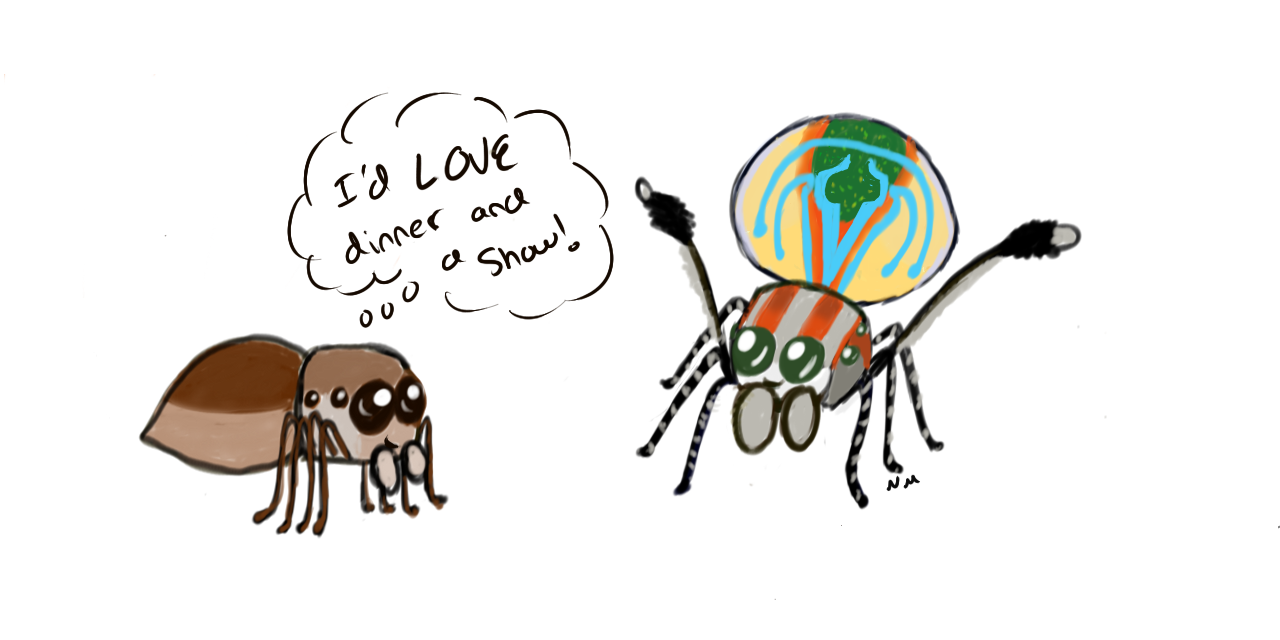Mantises don’t eat their mates very often. However, if female Peacock Jumping Spiders are unimpressed by the male’s dance moves, she will try and eat him.