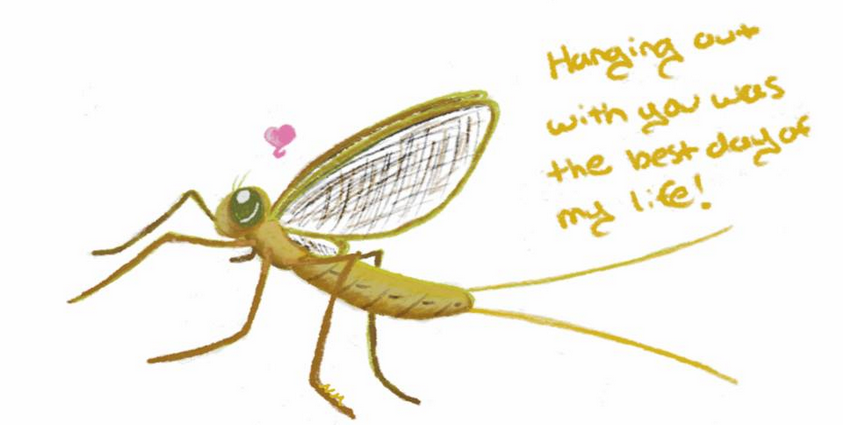 Mayflies have mass emergences. That day they all “hatch” as an adult, mate, lay eggs, then die. They don’t even have mouthparts to eat!