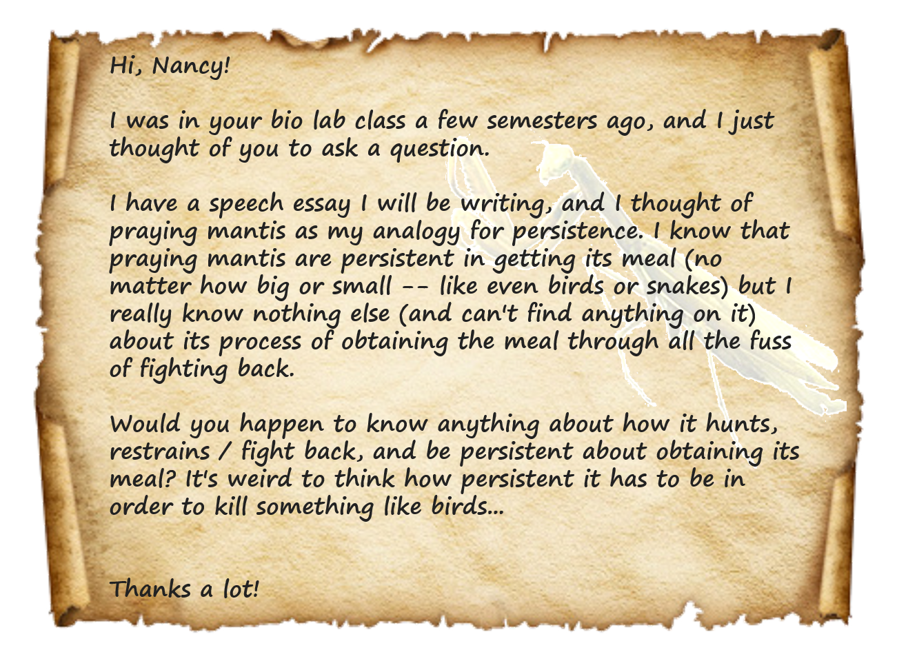 The other day I received an email from a former student about the persistence and strength demonstrated by praying mantises.