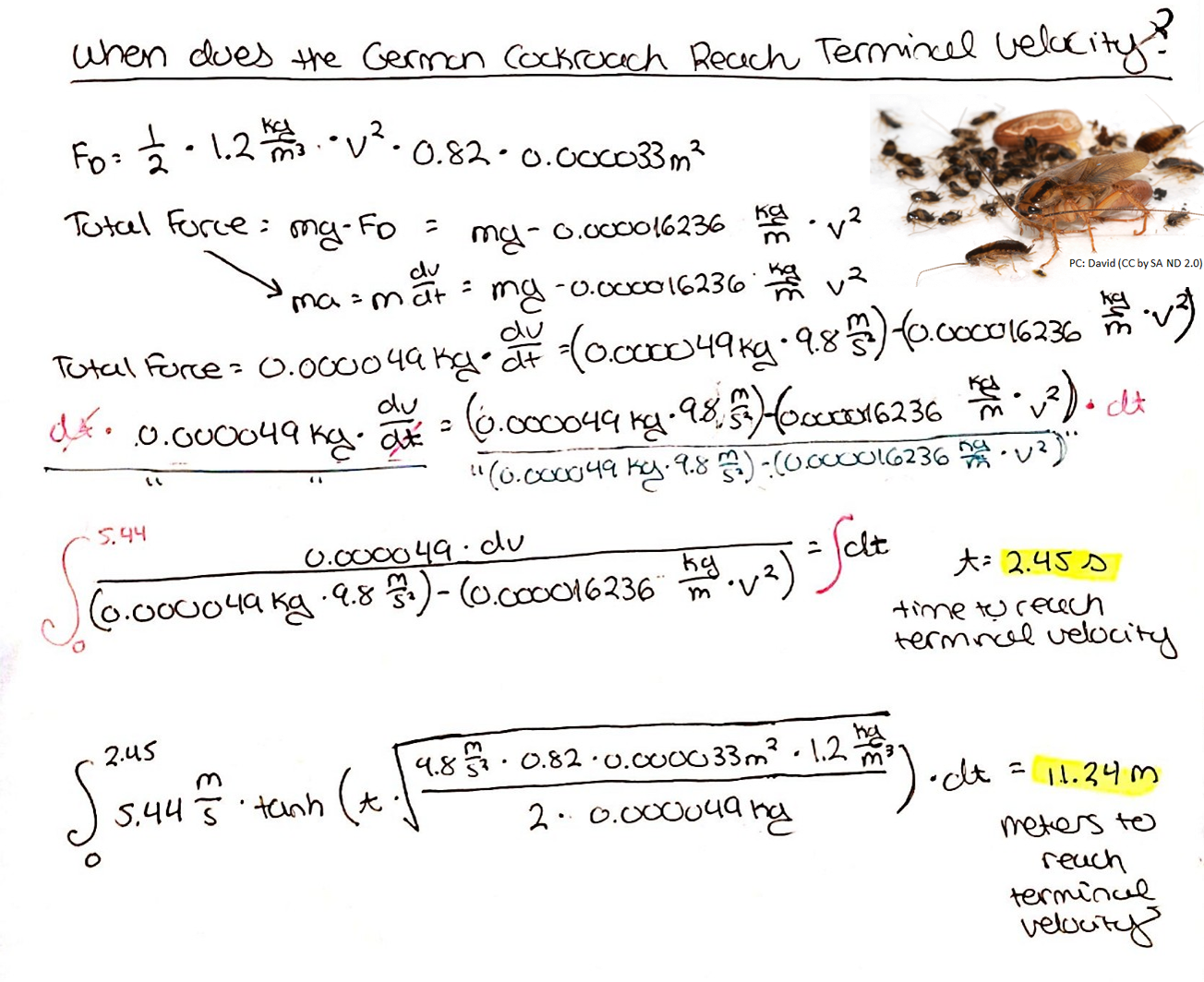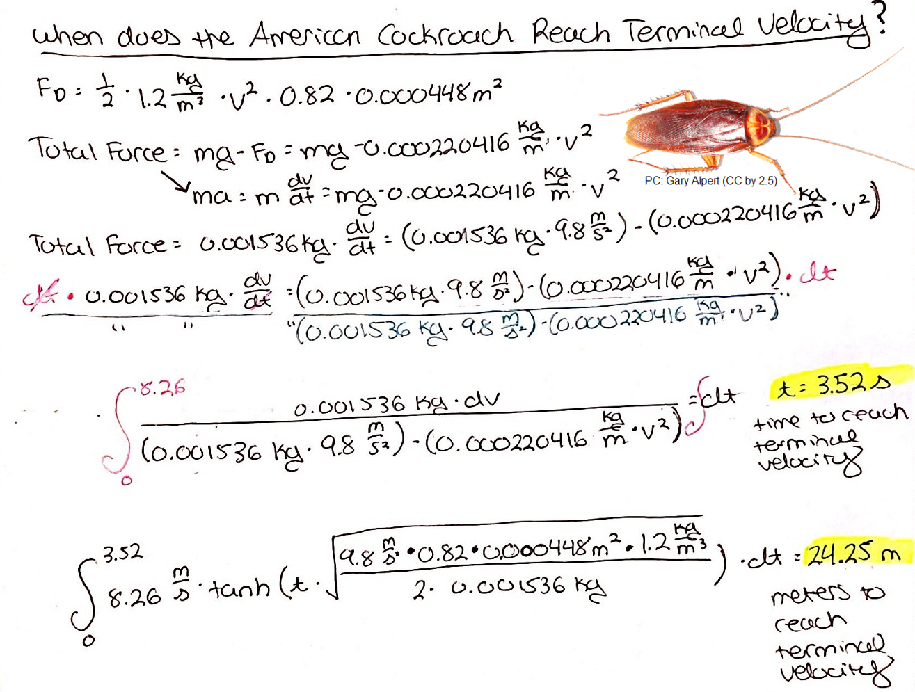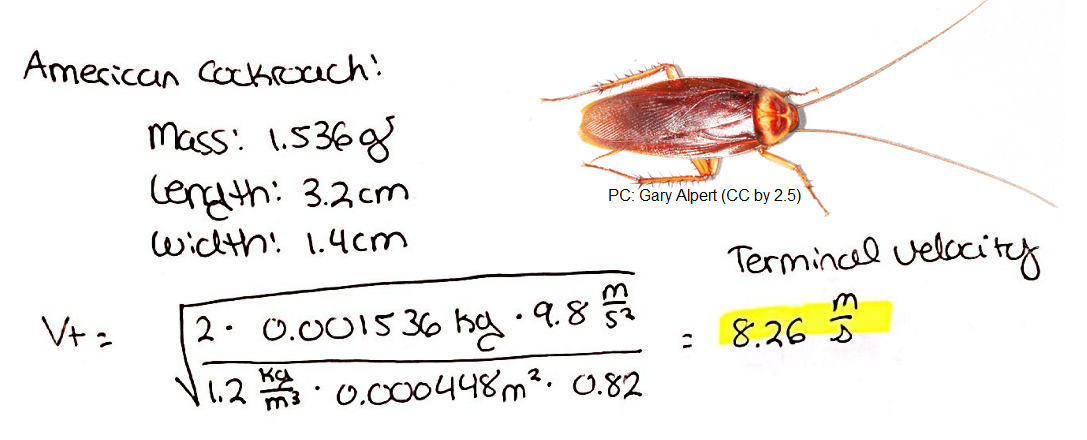 The question at hand is basically a terminal velocity question. At what point will a cockroach in free fall reach terminal velocity, or the fastest the cockroach could fall due to gravity’s pull, and how much damage will that speed do when it smacks into the ground.