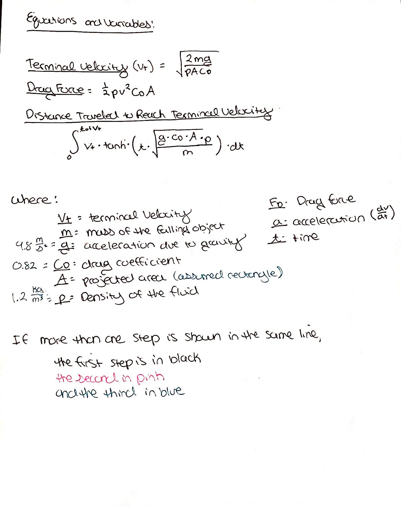 Projected area for the cockroach was assumed to be a rectangle since we assumed it would probably fall flat and flutter around instead of nose diving. We used the Drag Coefficient for a long cylinder since it looked the most “rectangley” compared to the others, and the cockroach is basically a cylinder. Again, we’re assuming the roach is falling flat. Air density was averaged between the top of the Empire State Building and the bottom. The acceleration due to gravity was approximated to be 9.8 m/s².