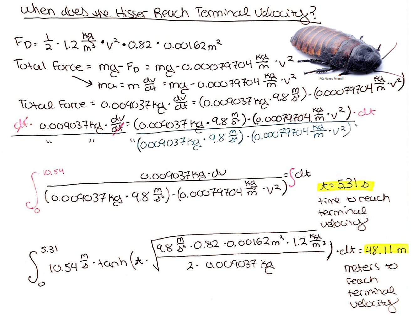 The first thing we did was to calculate the terminal velocity of the three cockroaches, using the dimensions of some of our own specimens. More details on that later. We found the terminal velocities to be 5.54 m/s (12.07 mph) for the German Cockroach, 8.26 m/s (18.48 mph) for the American, and 10.54 m/s (23.58 mph) for the Hisser.