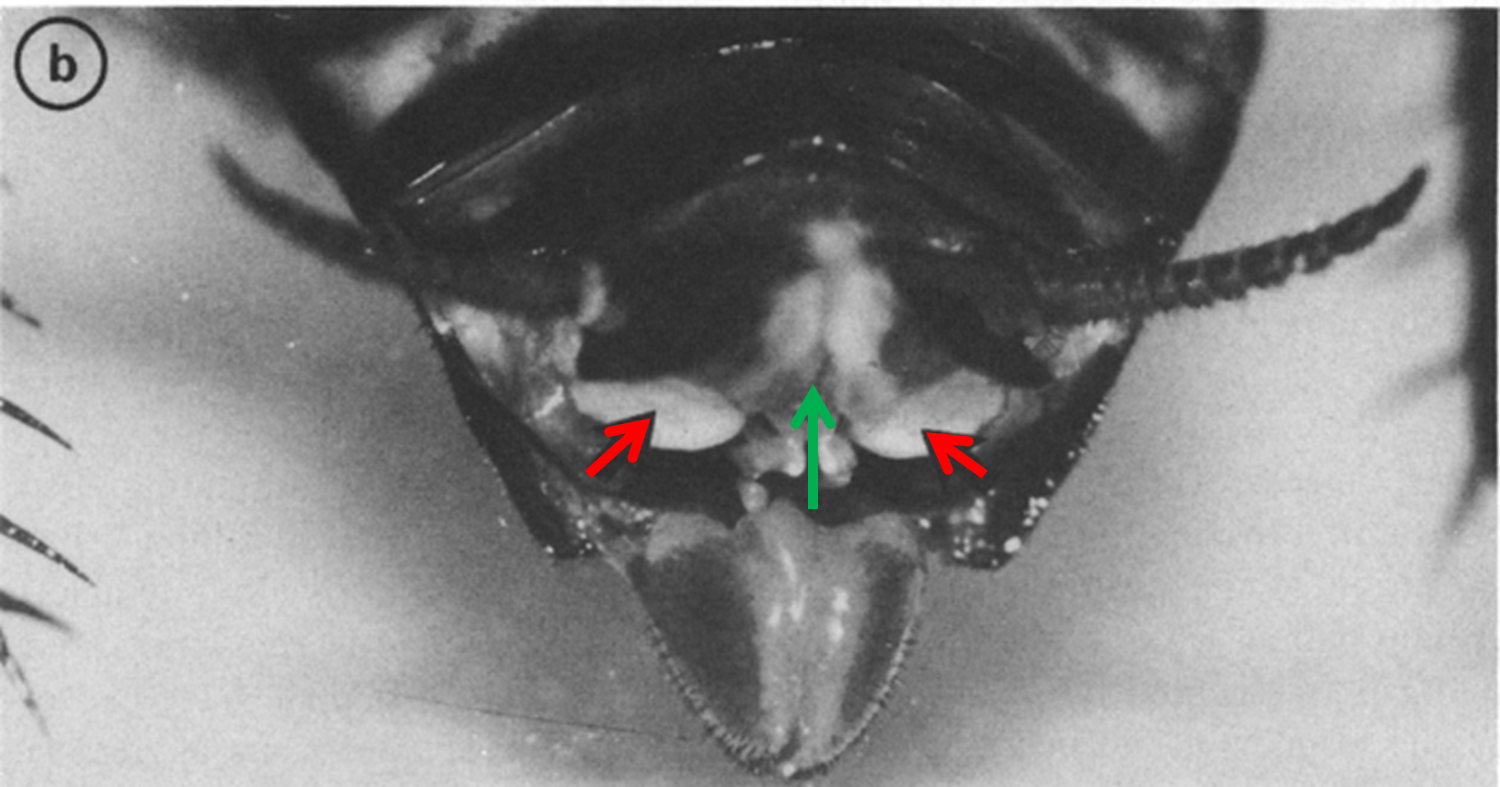 It’s interesting to note that this strong level of attraction has created some weird issues for researchers, because it’s hard to tell where the pheromone is actually produced. Early literature reports claimed that the pheromone was produced in the colon, but it appears to be produced in a pair of glands that are very close to the roach’s butt. These glands hare highlighted in red in the picture above, while the butt is highlighted in green.