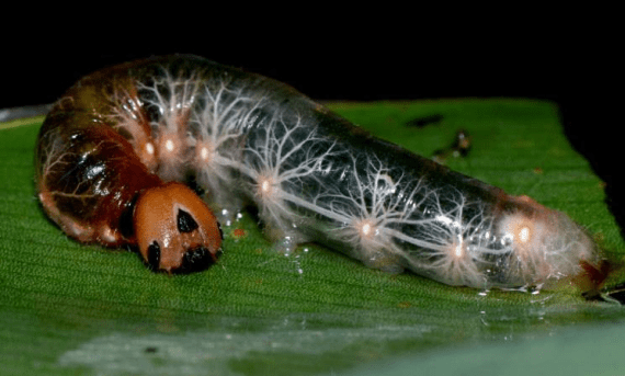 This is a naturally occurring transparent caterpillar! However, you can clearly see the the tracheal system connected to the spiraces.