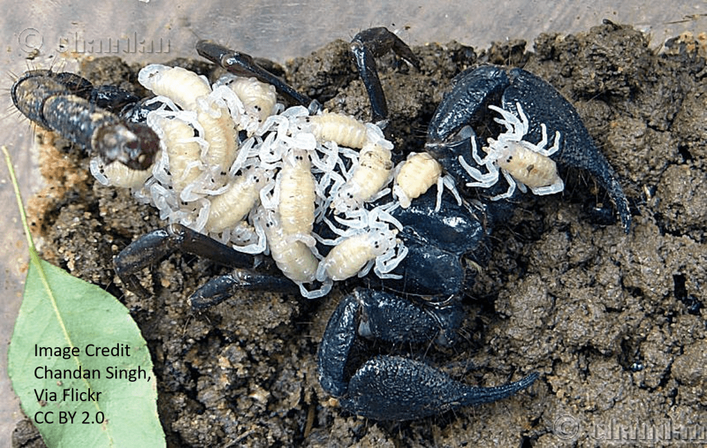When scorpions are born, they’re ghostly pale. They actually stand out against their mom, looking almost more like maggots than actual arachnids.