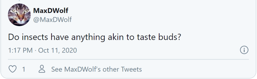 This question came in to me through my Twitter and I thought it was so interesting! Yes insects can and do taste. Yes it’s different than smelling for them. But do they actually have taste buds?