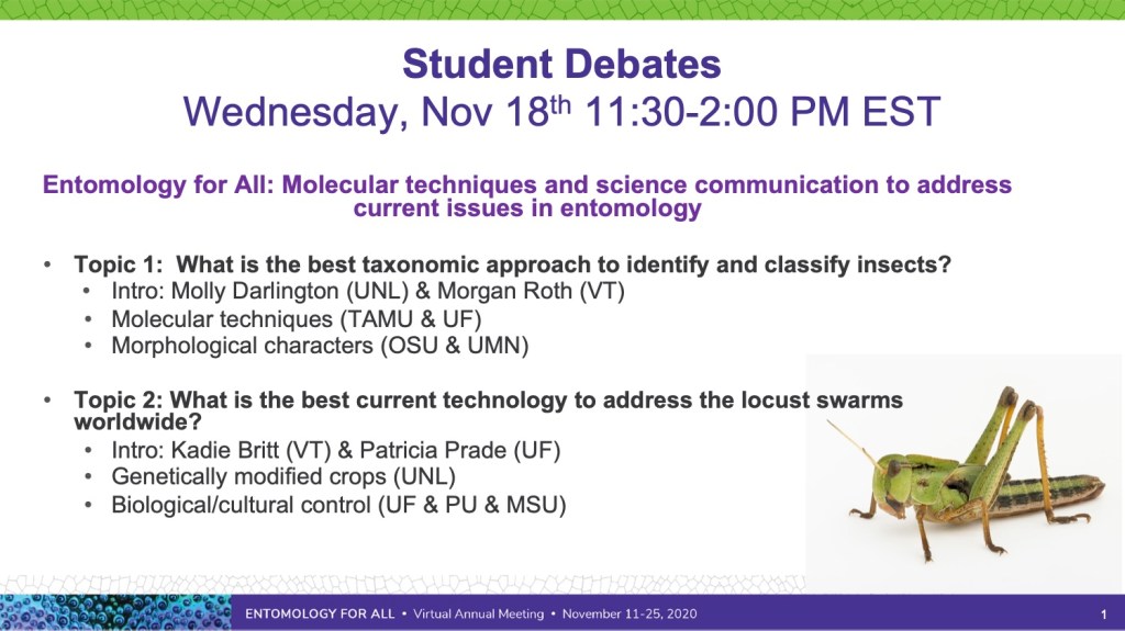 I’m also competing in student activities: The Entomology Games and ESA Student Debates. The Entomology Games is like a quiz bowl with questions spanning all areas of entomology: taxonomy, physiology, behavior, ecology, entomological history, medical & veterinary entomology, etc. Traditionally, to be able to play in the games at the national EntSoc meeting, your team had to place 1st or 2nd in the branch meeting (EntSoc has 6 branches – one of which is international). The format was moved online because most of the branch meetings were cancelled due to COVID-19. Through the hard work of the Entomology Games committee, the preliminary rounds were able to happen online. My team (Fabian List, Jaclyn Martin, Kenneth Masloski, & I) at Texas A&M University won 1st place for our branch (Southwestern Branch)! Therefore, we will be competing in the games on Monday, November 16th. This year I’m also participating in the Student Debates. My team consists of Morgan Thompson and Kelly Carruthers – Kelly is at the University of Florida and came up with the clever nickname “Aggatories” for our team. Our topic is “what is the best taxonomic approach to identify and classify insects?” and our stance is that molecular techniques are ideal. I haven’t done this event before and we’ve put in a lot of hard work, so I’m quite excited.