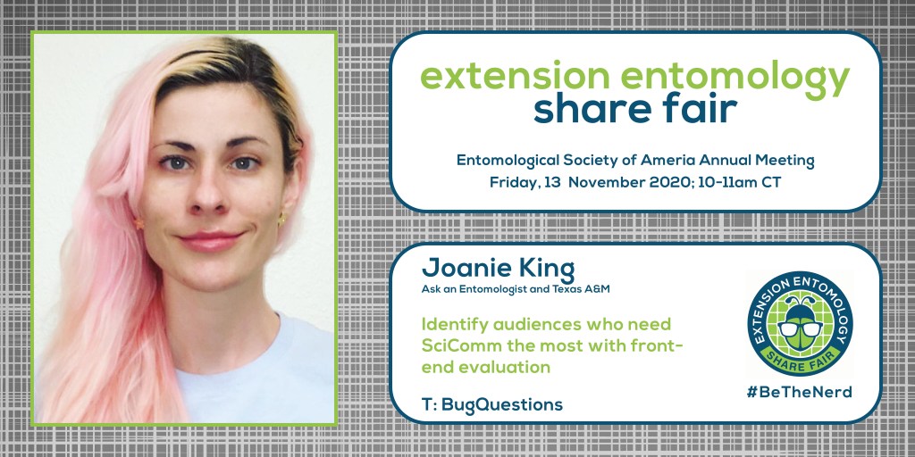 This year I’m participating in a live workshop on Zoom this Friday (11/13) called the Extension Entomology Share Fair. My topic is about identifying audiences who can benefit from SciComm by using front-end evaluation. It will be interactive by engaging participants in hands-on activities in survey building and discussion.