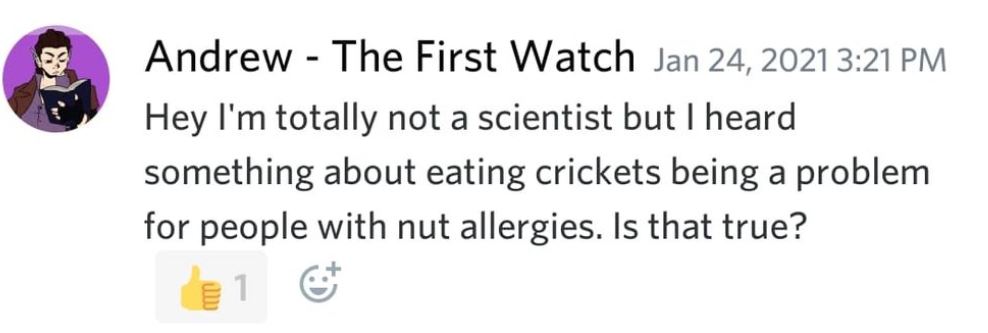 Because this was specifically about crickets and nuts, I wanted to focus on that. However, at the same time, I also felt a note about chitin would be appropriate just in case someone comes here looking for this kind of thing. There’s a lot of potential allergens, and not all of them are well characterized.