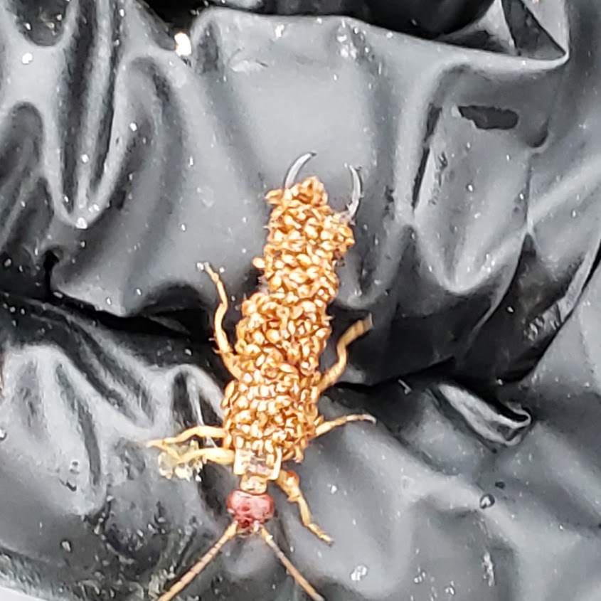 Shortly after I asked, they sent a picture. I let out a “gasp!” and thought “that’s not a female earwig… it’s a male! So those must be parasites on his back.” From what I can make out from the photo, it appears to be mites on the earwig’s back. There are mites which are phoretic (i.e., hitchhiking) on earwigs, but with so many, it’s got to be a problem for the earwig.