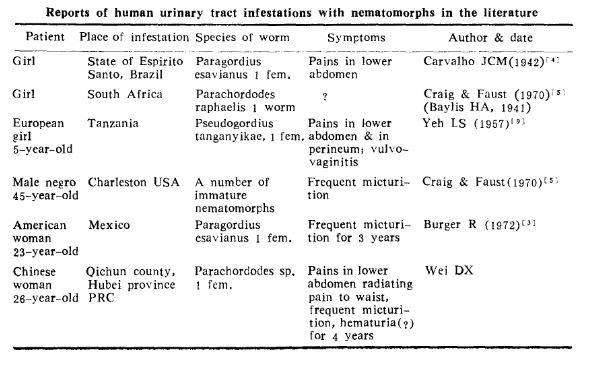 Dexiang, W., & Wenyuan, Y. (1981). Parachordodes sp.(Nematomorpha) human infestation of the lower urinary tract: the first case report in China. Acta Academiae Medicinae Wuhan, 1(2), 40-45.