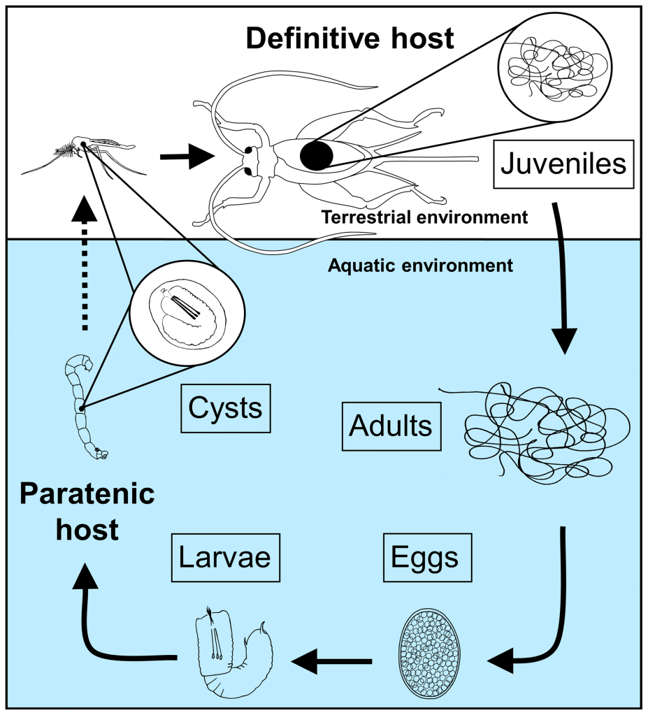 Anaya, C., Hanelt, B., & Bolek, M. G. (2021). Field and laboratory observations on the life history of Gordius terrestris (Phylum Nematomorpha), a terrestrial nematomorph. The Journal of Parasitology, 107(1), 48-58.