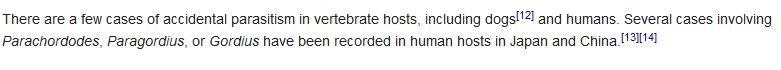 Yamada, M., Tegoshi, T., Abe, N., & Urabe, M. (2012). Two Human Cases Infected by the Horsehair Worm, Parachordodes sp.(Nematomorpha: Chordodidae), in Japan. The Korean journal of parasitology, 50(3), 263.