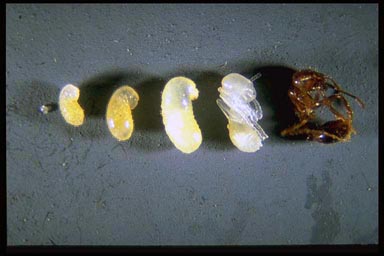 Life stages of a red imported fire ant (Solenopsis invicta) worker. Photo by Bart Drees. More photos at https://fireant.tamu.edu/materials/photo-gallery/