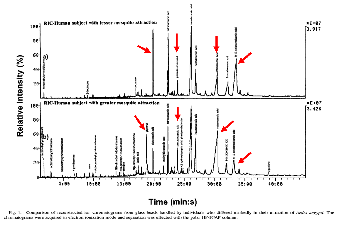 Barnard, D. R. (2002). Chemical analysis of human skin emanations: comparison of volatiles from humans that differ in attraction of Aedes aegypti (Diptera: Culicidae). Journal of the American Mosquito Control Association, 8(3), 186-195.